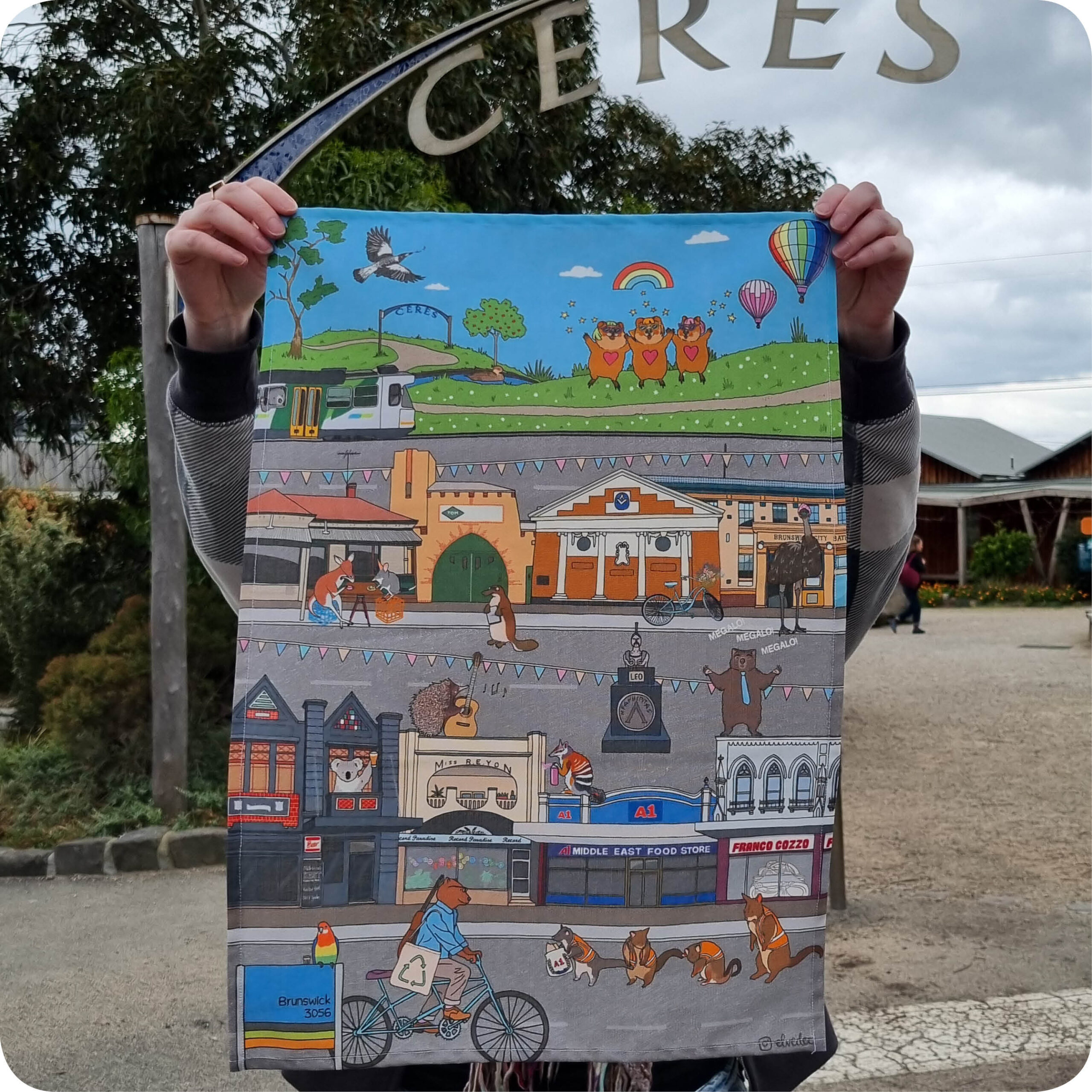 This Melbournian Mammals (and their mates) tea towel features many of our much-loved Australian animals enjoying Brunswick, a grungy vibrant suburb in Melbourne’s inner north. A kangaroo and bilby have brunch at A Minor Place, an echidna serenades the suburb from above Miss R.E. Yon’s ghost sign, an emu prepares for a midday swim at the Brunswick Baths, and a Franco Wombazzo announces “MEGALO! MEGALO! MEGALO!” above the Franco Cozzo shopfront. Up above, a magpie soars over the dancing BEEF (Brunswick East Entertainment Festival) girls, while down below, Sparkly Bear rides on. Oh, and did we mention the A1 Bakery cheese pie nomming possums?