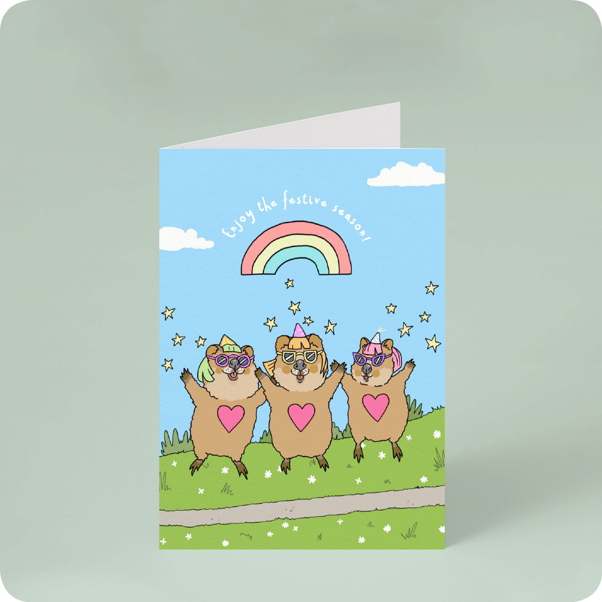 Say g’day to an Australian Christmas. This festive card stars three cheerful quokkas – Australia’s happiest animal! These Aussie animals are dancing outdoors under the sunny skies. Wearing bright party hats and full of joy, they’re here to help you enjoy the Festive Season, with their boundless energy and charm. Inspired by the much-loved Brunswick local legends, the BEEF Girls (Brunswick East Entertainment Festival dancers), this card has a fun local backstory. But even if you’ve never heard of them, who wouldn't loves three quokkas dancing their way through the festive season.