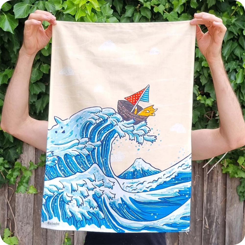 A whimsical take on a classic masterpiece. Inspired by The Great Wave off Kanagawa by Katsushika Hokusai, this design features a powerful wave with a feline face and countless cat paws forming its crest. Atop the mighty wave, a slightly worried cat sails in a tiny rowboat—trying to stay afloat in style despite the chaos.
