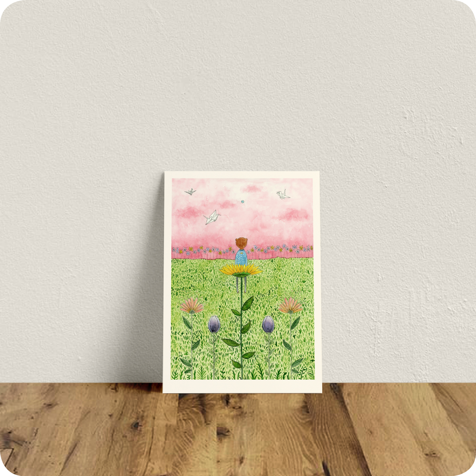 This illustration captures a contemplative bear sitting atop a tall flower, gazing out over a tranquil sunset. Origami cranes glide gracefully across the sky, adding a sense of whimsy to the peaceful scene. Inspired by the concept of a ruckenfigur—a figure viewed from behind to evoke reflection and solitude—this artwork invites the viewer to pause and reflect.